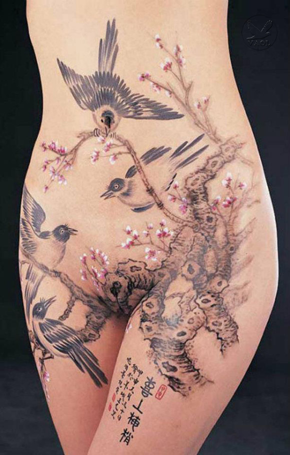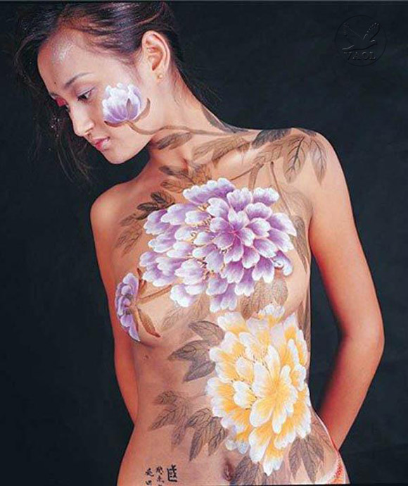 vẻ hình núi non, sông nước, muôn hoa, bướm và chim trên cơ thể người mẫu.
