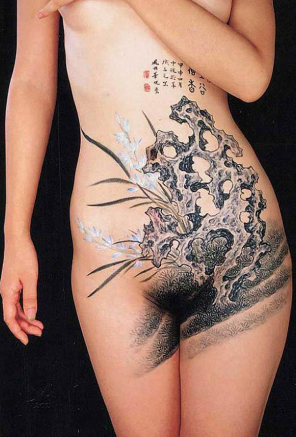 vẻ hình núi non, sông nước, muôn hoa, bướm và chim trên cơ thể người mẫu.